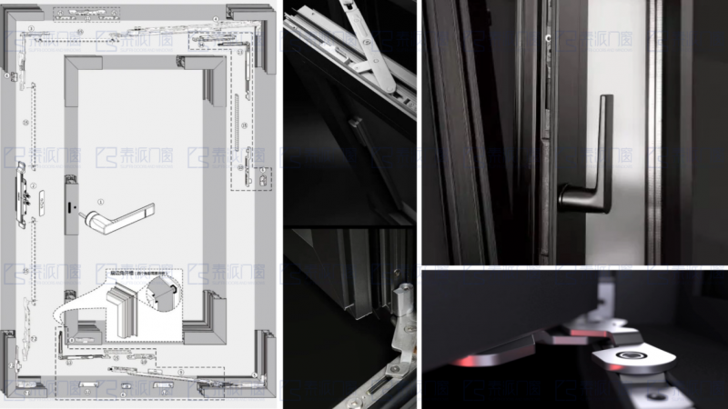 素派门窗选择进口德国roto诺托五金系统,执手、铰链、锁点等全套系统模块组合,铰链承重高,支持落地窗大开启扇,开启顺滑。采用多锁点四周分布,RC3级安全防护,密封防盗。