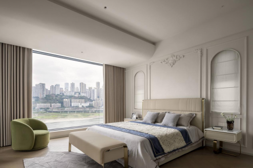 卧室空间布局遵循“以人为本”的设计理念,宽敞而不失温馨,开放而不失私密。主卧区域与更衣室、独立卫浴间形成流畅的动线,既保证了功能区间的独立性,又实现了空间的连贯。大开间设计,使得阳光能毫无保留地洒满整个房间,赋予空间明亮而通透的感染力。