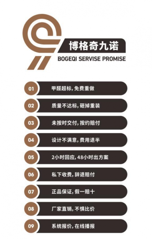 为了给客户提供真正的一体化或定制化产品解决方案,让不锈钢家居的高端不只是停留在概念上,博格奇还率先升级品质标准,提出“甲醛超标,免费重做”、“质量不达标,砸掉重装”、“未按时交付,按約赔偿”……等超高交付的“博格奇九诺”标准。