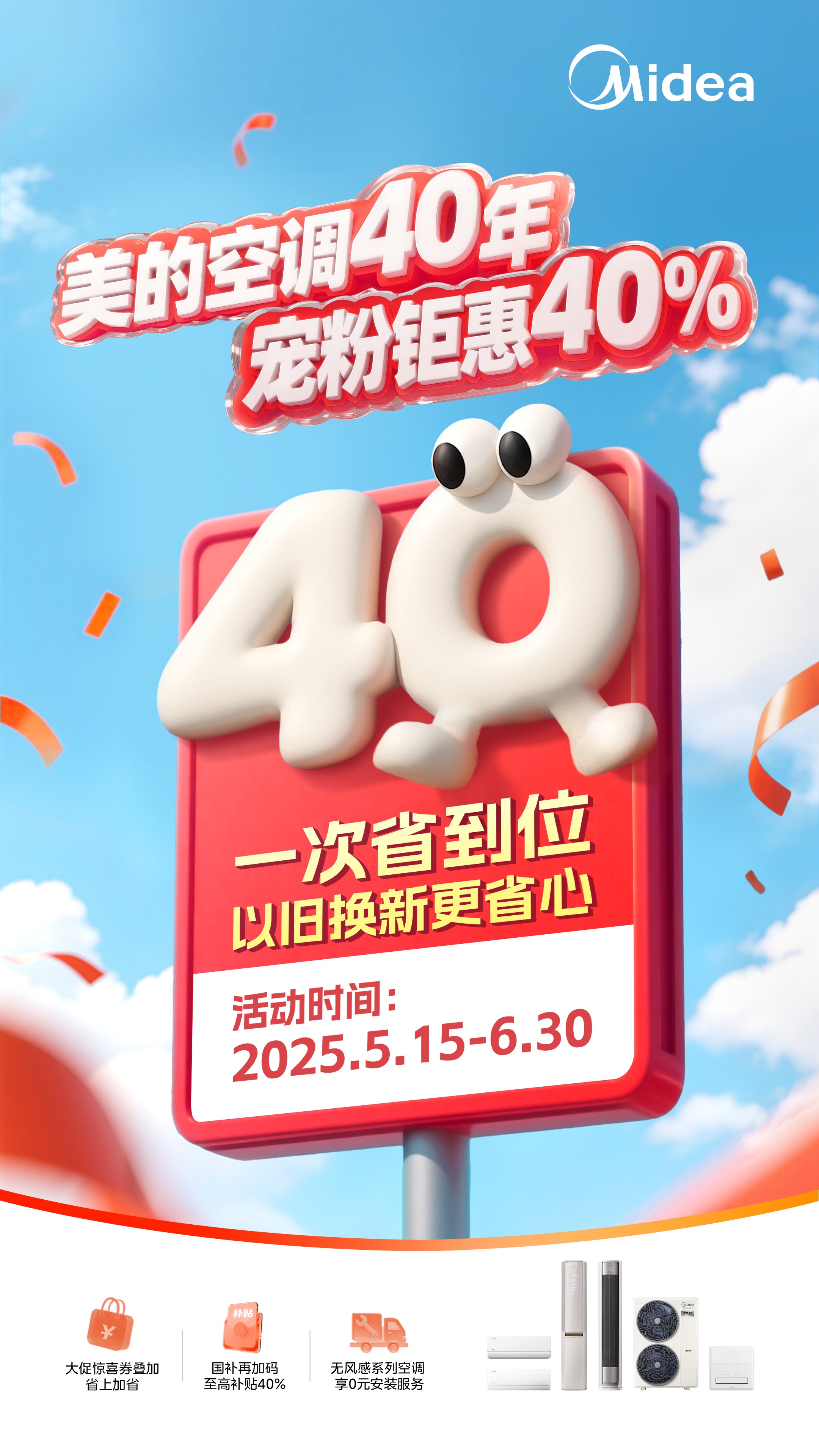 今年正值美的空调成立40周年的重要时刻,为了回馈广大消费者的支持与厚爱,美的空调推出了“美的空调40年,宠粉钜惠40%”的重磅活动。5月15日至6月30日,消费者通过主流电商平台搜索"美的空调"进入品牌官方旗舰店选购产品,可享超值折扣、现金补贴、大促惊喜券至高可减500元等,更有换新补贴、无风感系列空调0元安装服务、整机超长包修等多重福利,多平台优惠政策叠加至高补贴40%!让消费者能以更实惠的价格购入美的空调。