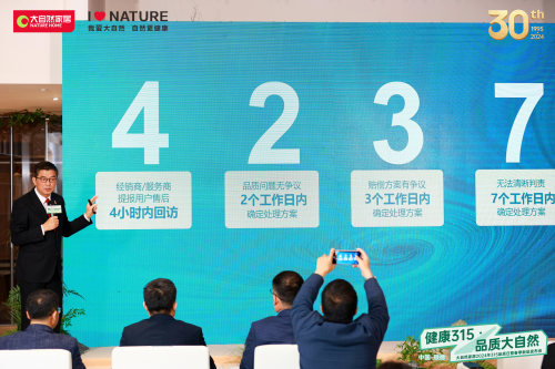 在发布会现场,大自然家居宣布推出全新的《大自然实木地板快理快赔服务标准》,快速处理品质售后,专人跟踪处理至完成结果,总部客服回访客户,形成服务闭环,旨在为消费者提供更加便捷、高效的售后保障。